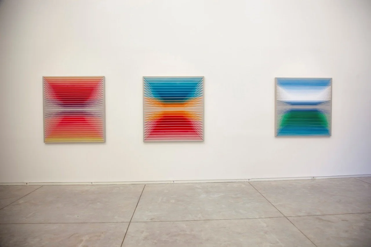 This instability becomes a generative force. As the viewer moves, surfaces curve, shadows invert, and planes dissolve into reflection. In the paintings, geometric restraint combines with vibrational bands of color to produce conditions of suspension. In the sculptural works, repetition intensifies sensitivity—drawing attention to subtle variations as the structures tilt, repeat, and adjust to the viewer’s position.