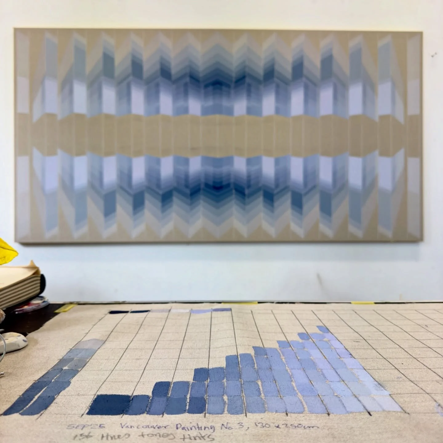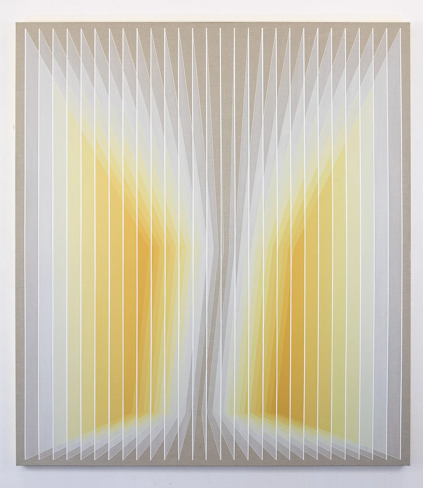 1.Proximity XIV:Primary Yellow Intervals with Viloet–Magenta Recession. Acrylic on linen, 2025.